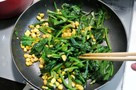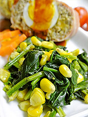 2.中火で温めサラダ油を入れコーン→ほうれん草の順に入れ、すぐに塩コショウ・コンソメを入れてしんなりしたら火を止める。